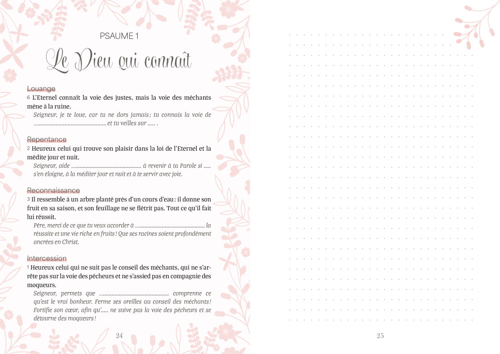 Prier régulièrement pour nos enfants et petits-enfants est l’une des choses les plus précieuses que nous puissions faire pour eux ! Pour nous y aider, ce magnifique journal de prière, qui parcourt chacun des 150 Psaumes de l’Ecriture, nous invite à proclamer les promesses de Dieu en faveur des enfants qui nous sont donnés à aimer, puis à noter nos réflexions et propres requêtes sur les pages prévues à cet effet.