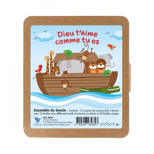 Joli pack Arche de Noé en kraft, composé d’un bloc de coloriage avec 12 motifs d’animaux à colorier et de 30 feuilles de papier vierges. La boîte de 12 crayons de couleur et intégrée dans la boîte !