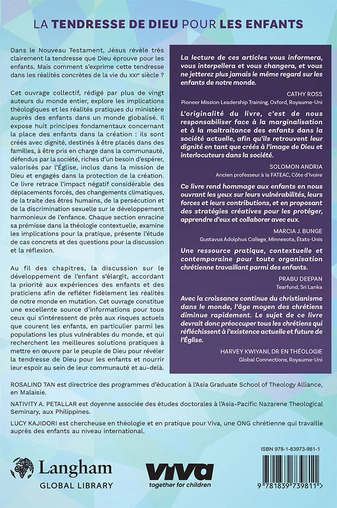 Cet ouvrage collectif, rédigé par plus de vingt auteurs du monde entier, explore les implications théologiques et les réalités pratiques du ministère auprès des enfants dans un monde globalisé. Il expose huit principes fondamentaux concernant la place des enfants dans la création : ils sont créés avec dignité, destinés à être placés dans des familles, à être pris en charge dans la communauté, défendus par la société, riches d’un besoin d’espérer, valorisés par l’Église, inclus dans la mission de Dieu et engagés dans la protection de la création. Ce livre retrace l’impact négatif considérable des déplacements forcés, des changements climatiques, de la traite des êtres humains, de la persécution et de la discrimination sexuelle sur le développement harmonieux de l’enfance. Chaque section enracine sa prémisse dans la théologie contextuelle, examine les implications pour la pratique, présente l’étude de cas concrets et des questions pour la discussion et la réflexion.
