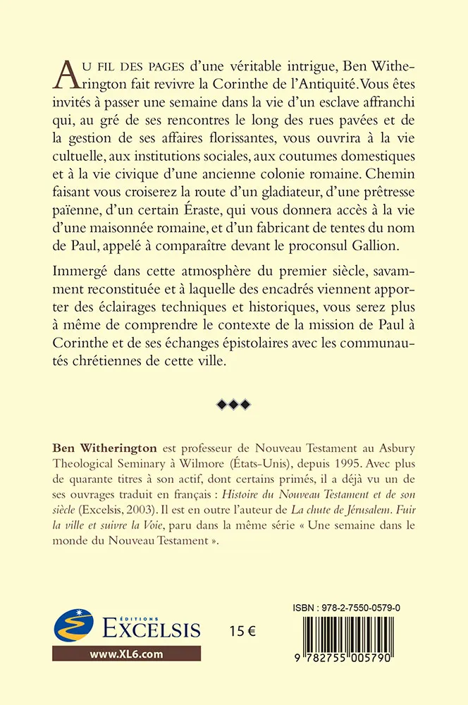Au fil des pages d’une véritable intrigue, l’auteur fait revivre la Corinthe du 1er siècle à travers les yeux d’un esclave affranchi. En parcourant la ville antique, on découvre son quotidien économique, religieux et social, croisant au passage des figures historiques comme Paul, Eraste ou le proconsul Gallion. Le récit, vivant et documenté, est enrichi de nombreux encadrés historiques qui éclairent les coutumes et institutions de l’époque. Cette expérience unique permet de mieux comprendre le contexte de la mission paulinienne à Corinthe et la portée de ses lettres aux chrétiens de la ville.