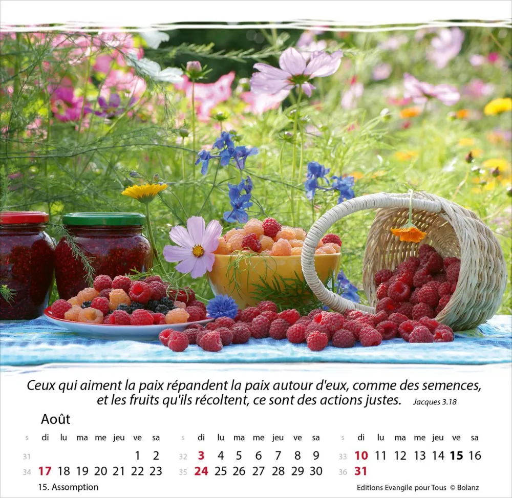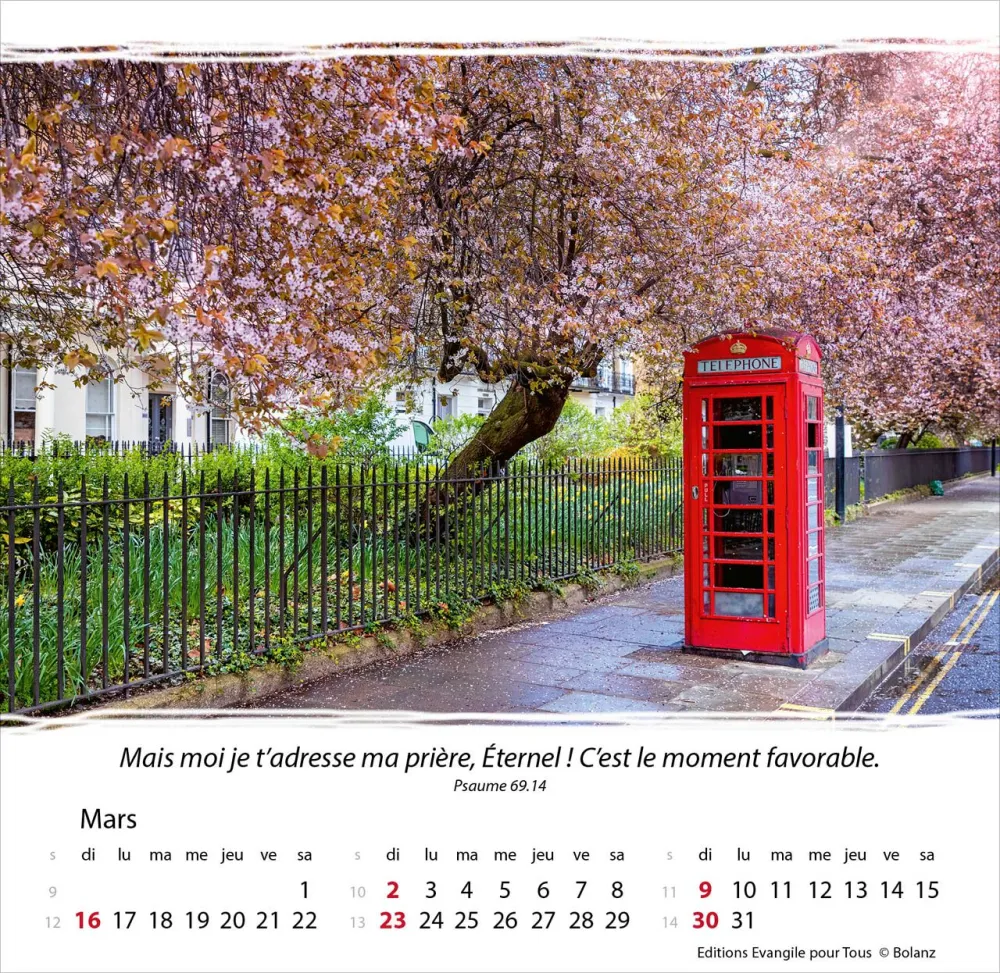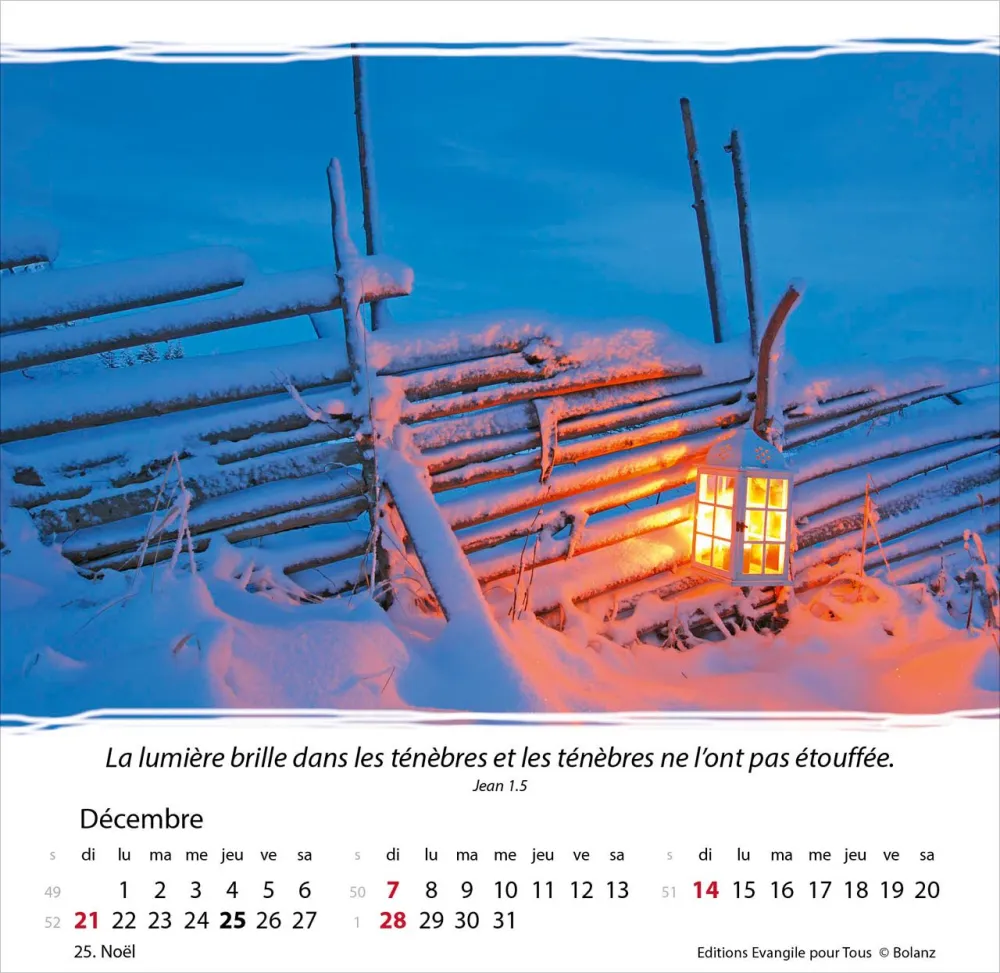Calendrier à offrir, avec une méditation du texte biblique au verso. Espérance et confiance pour toute l’année. 12 photos extraordinaires, des versets bibliques appropriés, avec spirale et support pour poser. Cartes avec versets bibliques à découper.
